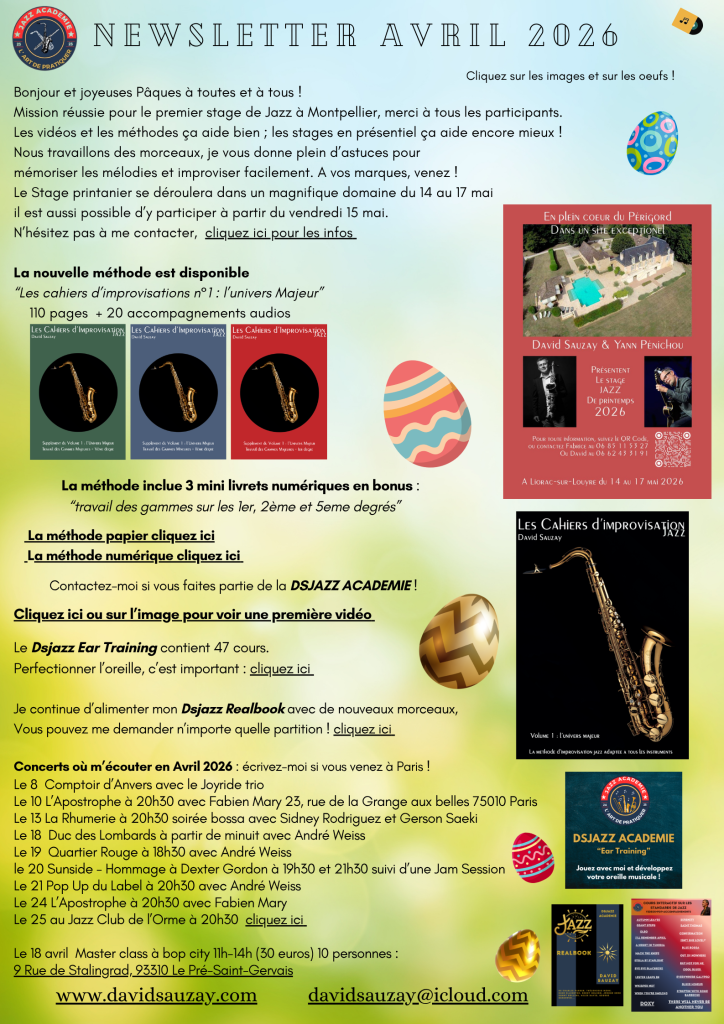 Dsjazz Ear Training ! C’est nouveau et c’est indispensable ! 3 euros par mois pour progresser avec des cours interactifs je vous apprends à développer votre oreille, le tempo, du vocabulaires et des thèmes et tout ça sans partitions !! Vous devez avoir un compte Youtube et cliquez sur « rejoindre » sous la vidéo