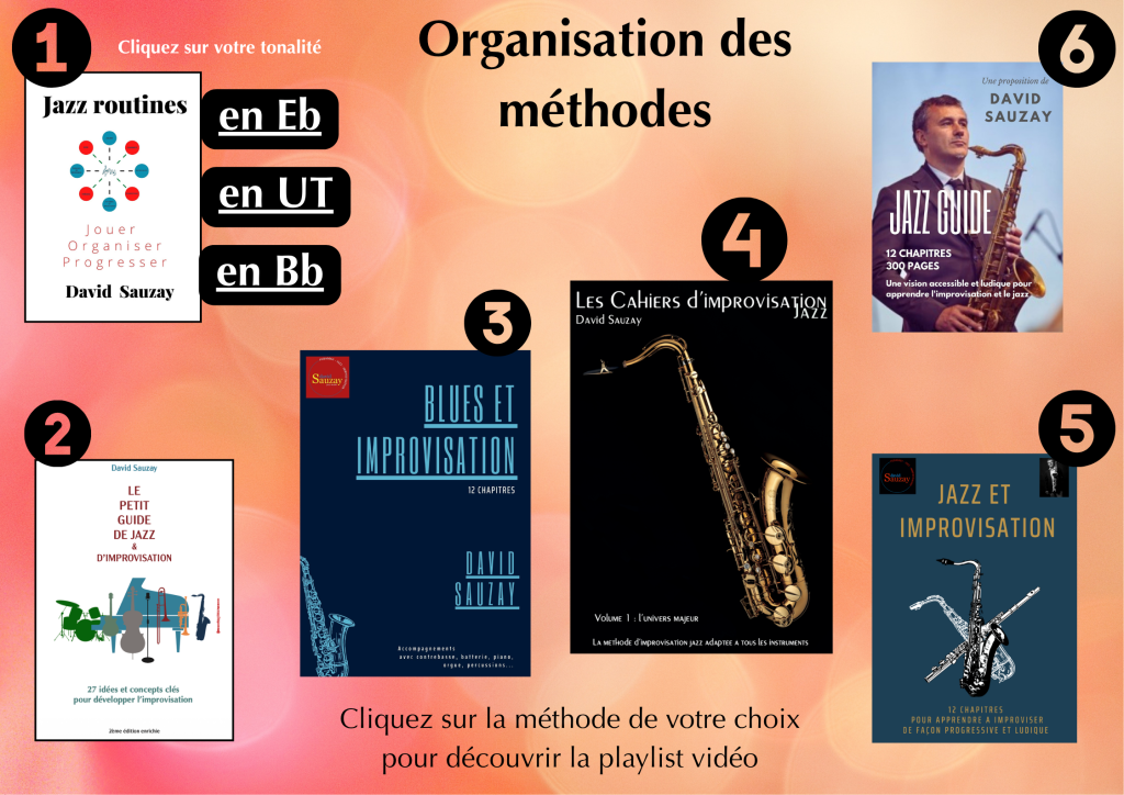 Les cahiers d’improvisation – Volume 1 : L’univers majeur Cette méthode est née d’une intention claire : vous aider à mémoriser du vocabulaire tout en développant votre créativité. Improviser ne consiste pas seulement à connaître des gammes, mais à savoir les utiliser avec intention. Trop souvent, une phrase commence “au hasard”, sans repères précis. Ce cahier propose une approche concrète pour construire des réflexes, structurer vos idées et gagner en fluidité. Dans ce premier volume consacré à l’univers majeur, le travail s’organise autour de plusieurs axes : Associer les gammes : pentatonique(5) , éxatonique(6), heptatonique (7) à des débuts de phrases (motifs) : 135, 125,235, 351 ect… Explorer de nombreuses combinaisons pour multiplier les possibilités de phrases Développer des automatismes permettant de démarrer et finir une idée de manière claire et maîtrisée Apprendre à mettre en valeur les notes phares des accords. (La tierce étant déjà présente) les notes importantes de l’accord majeur (Ier degré) : 7ème et 4rte celles de l’accord mineur (IIe degré) : 9ème, 11ème et celles de l’accord de dominante (Ve degré) : 6xte, 4rte Au fil des exercices, vous développerez : une meilleure aisance dans le tempo, une capacité à naviguer dans les structures harmoniques et un langage plus cohérent, précis et personnel. L’objectif n’est pas de répéter mécaniquement, mais de vous approprier le matériau, de le transformer et de l’utiliser librement dans votre propre expression. Je vous propose également de jouer sur + de 20 accompagnements pour la mise en pratique. il vous propose des outils. À vous de les explorer, de les adapter et de construire votre propre discours musical. Acquérir la methode en papier : cliquez ici Acquérir la méthode en numérique : cliquez ici |